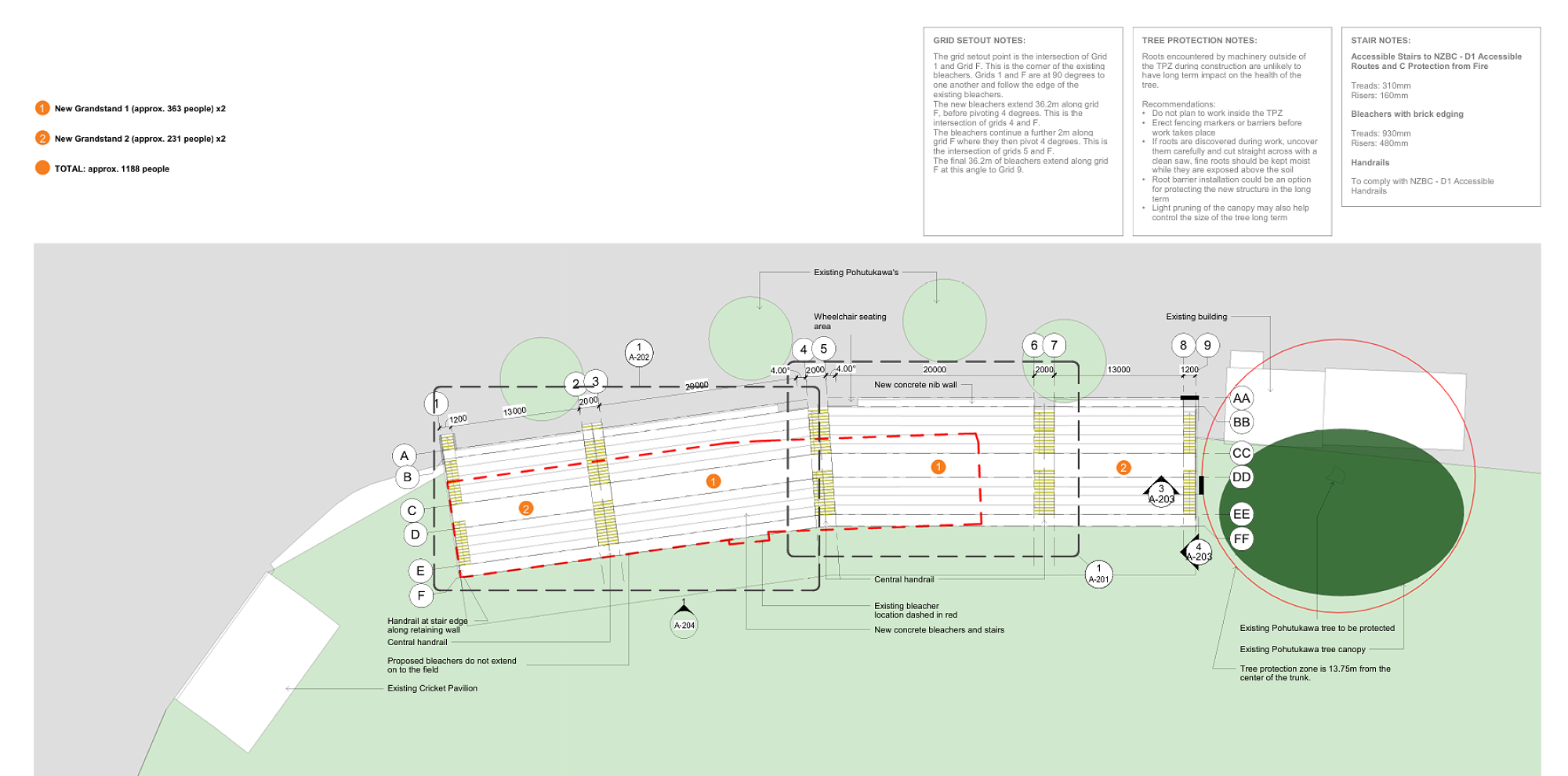 The red lines indicate the current original Terraces. The new design increases the Terraces by almost double. Five stairways, with handrails, ensure safe acess. A reduced gradient creates comfortable ampithreatre seating. A landing between the seating and at the bottom of the Terraces allows for access and stops people standing on wet grass.